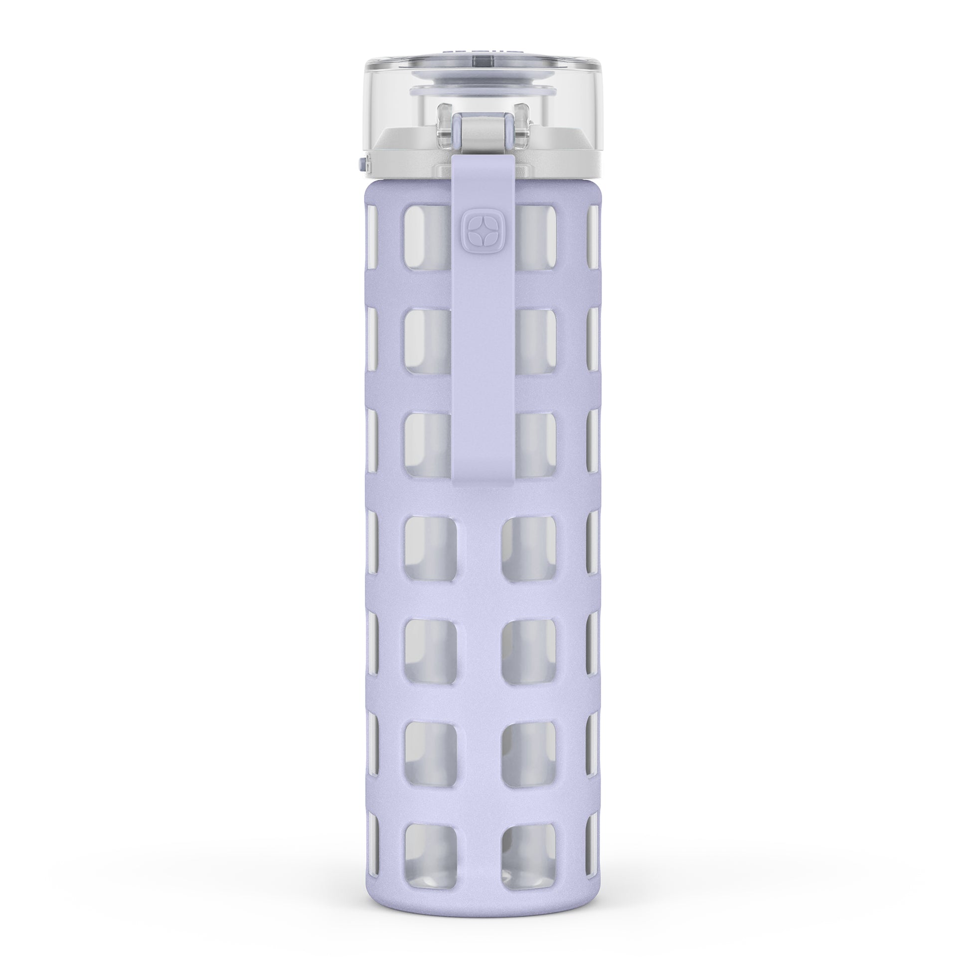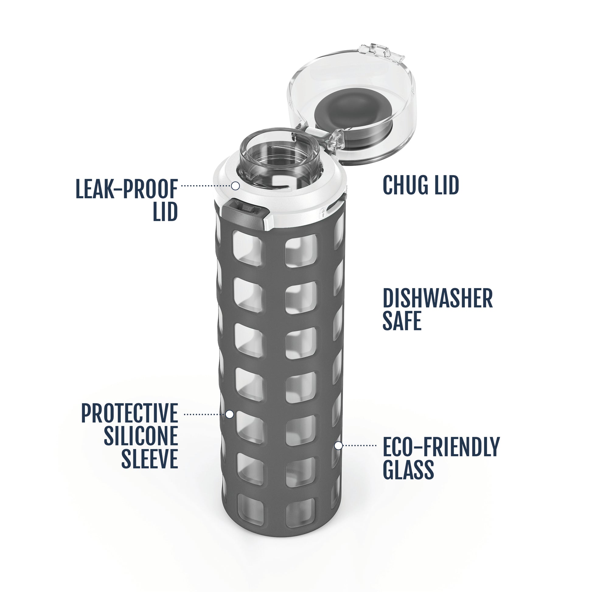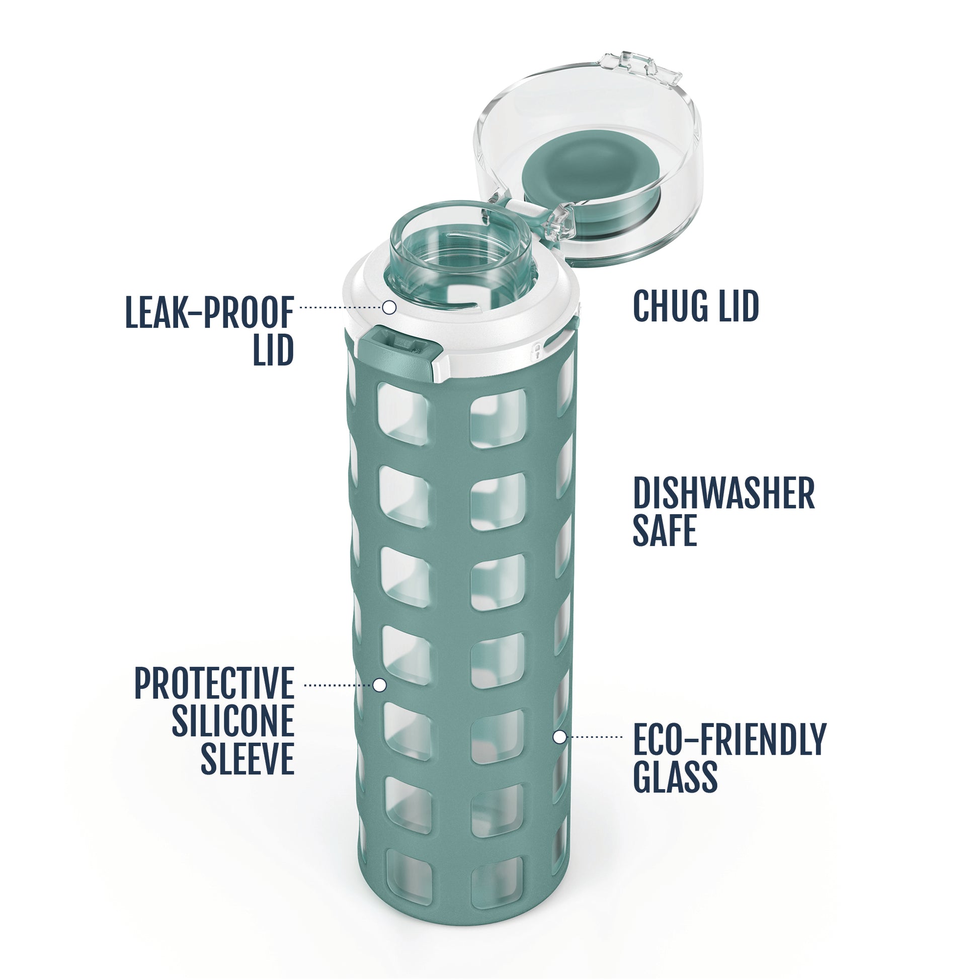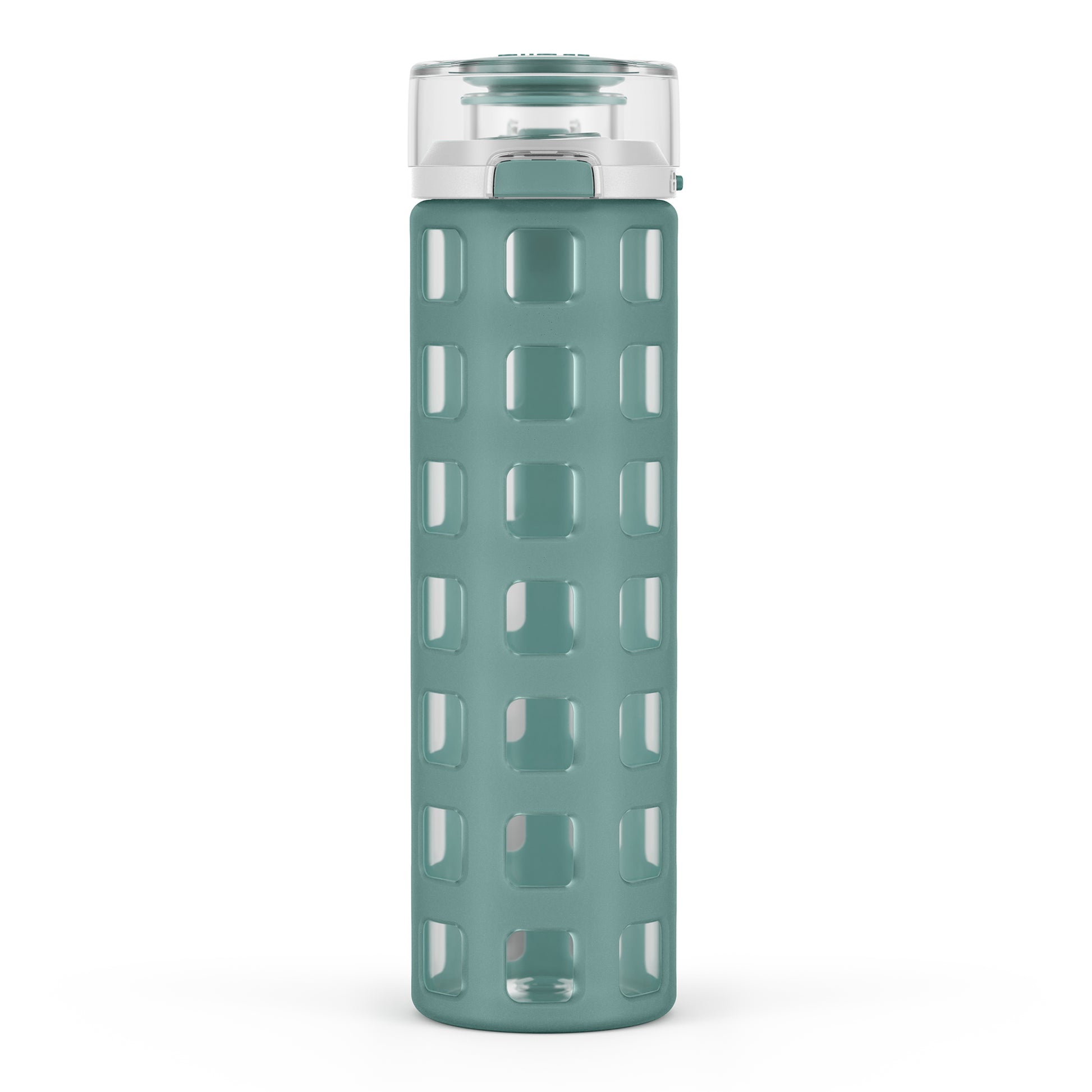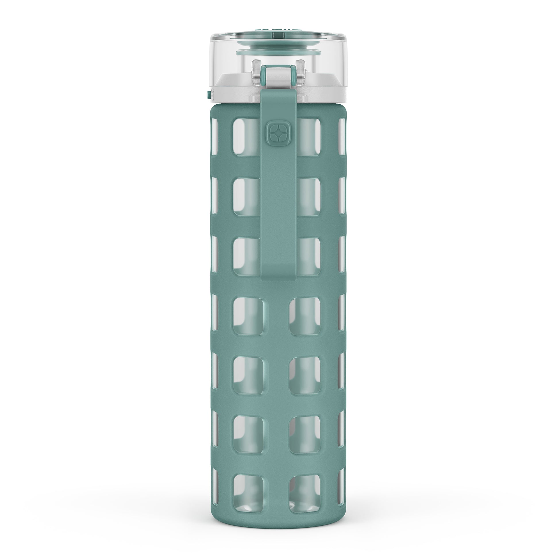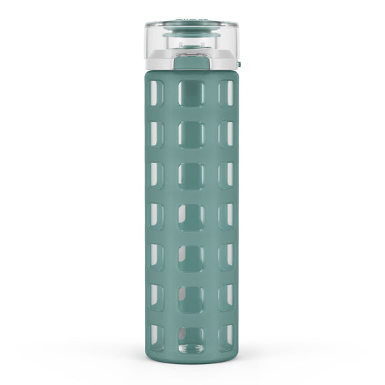The Ello Syndicate Glass Water Bottle is made of clean-tasting glass that won't leach, stain or smell. Syndicate's one-touch flip lid makes it easy to pop and drink directly from glass, not plastic. FDA food-grade silicone sleeve protects the glass and provides a no-slip grip.