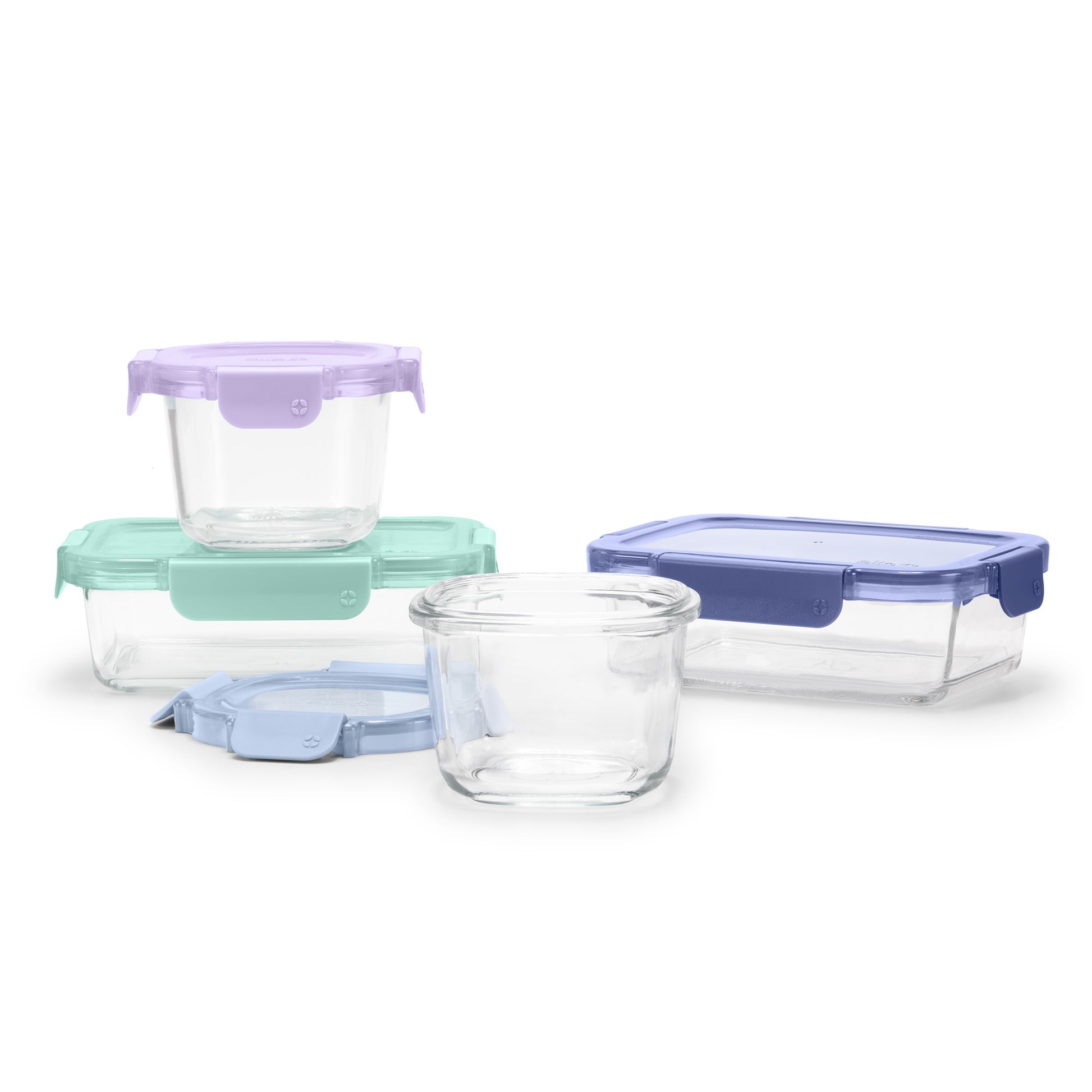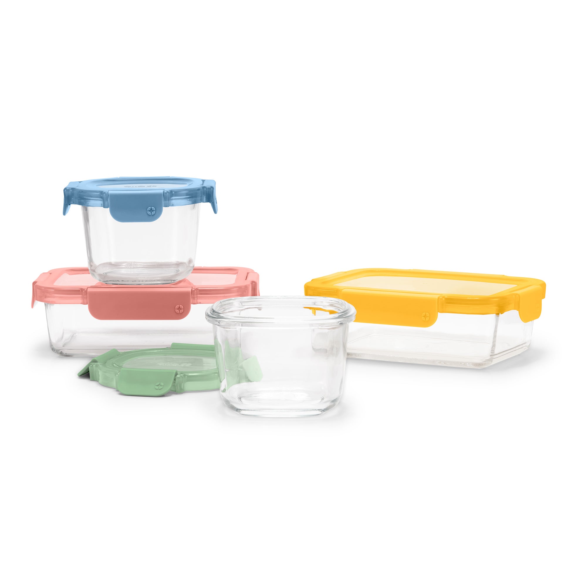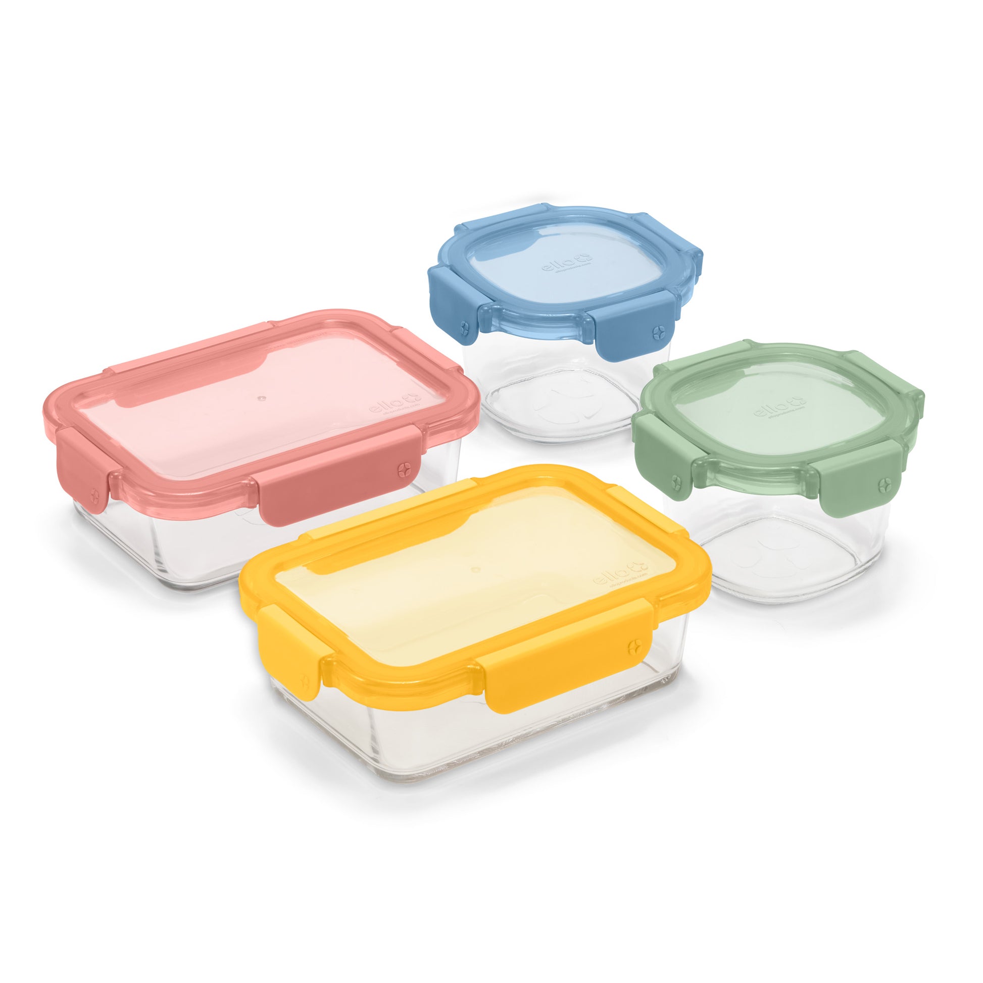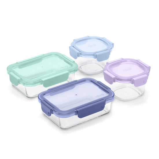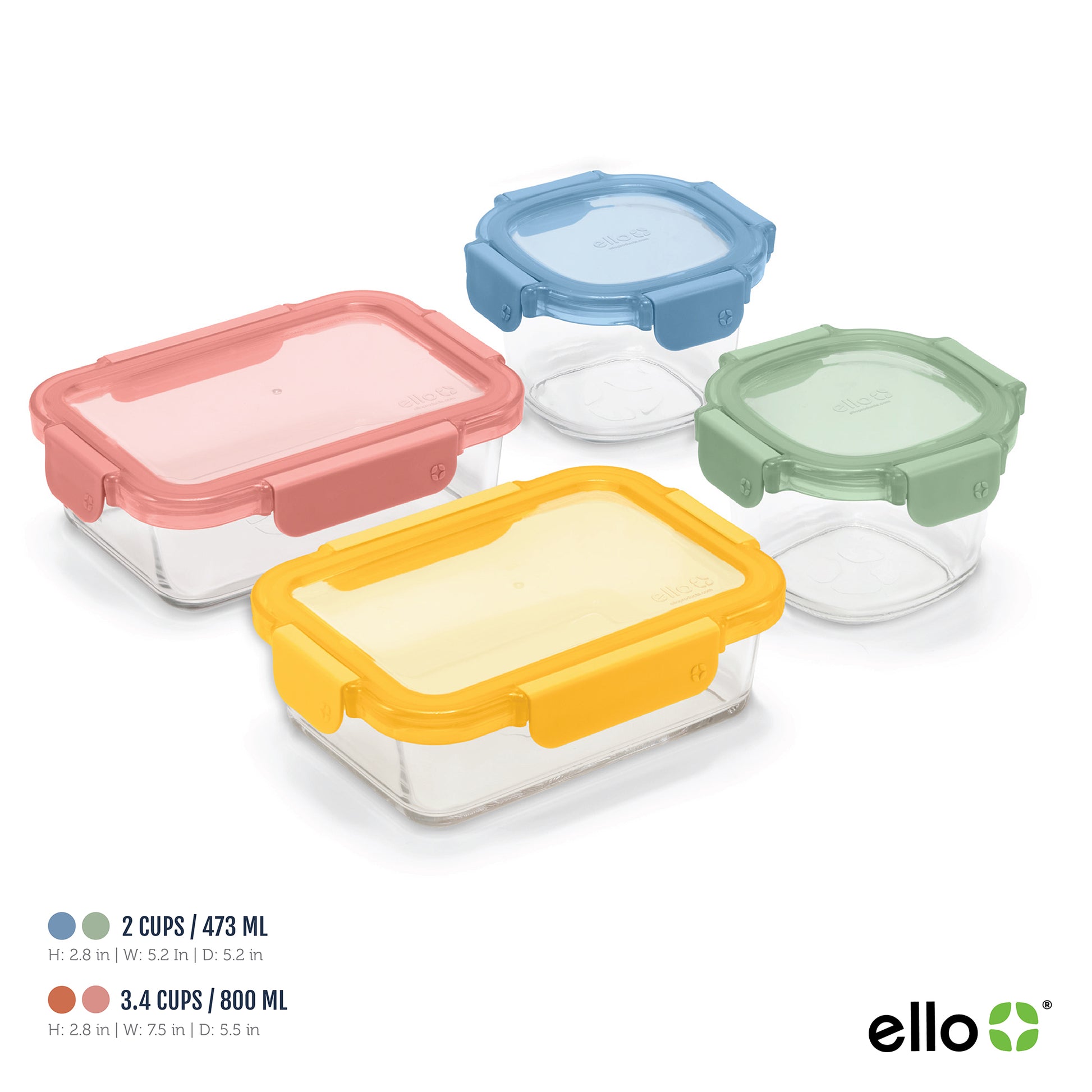 Ello Duraglass™ Color Lock® 8pc Meal Prep Food Storage Containers includes (2) 2 cup round glass condiment containers, (2) 3.4 cup glass food container and (4) BPA-free plastic locking lids to keep food fresh for longer.