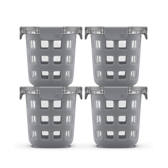 This bundle consists of 4 Ello Duraglass™ 3 Cup Round glass food storage containers. These are perfect for Mason jar meals, layered salads and overnight oats. Ello Duraglass™ features a leak-proof lid and an extra thick silicone sleeve that protects the glass from chips and breaks. A crystal clear lid lets you see contents inside and includes air tight snaps that won't leak.