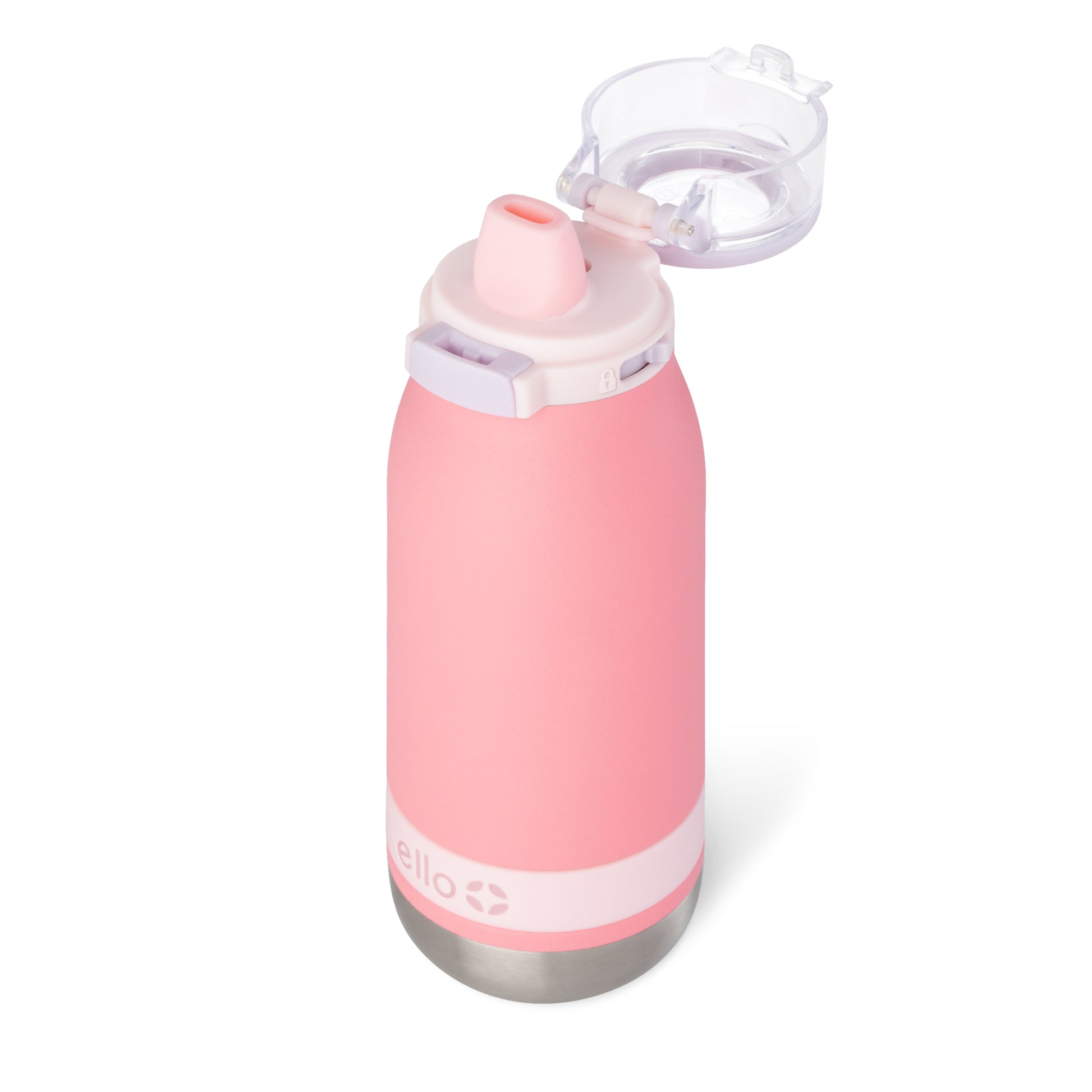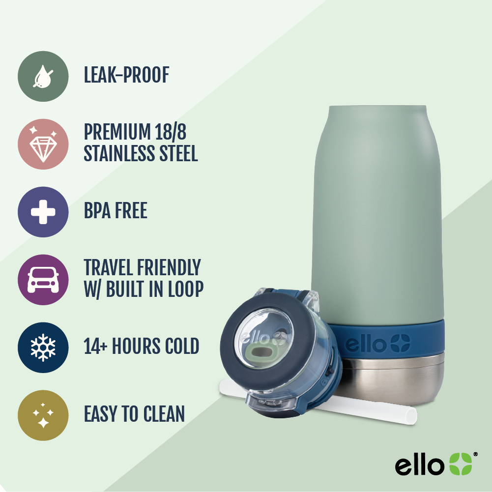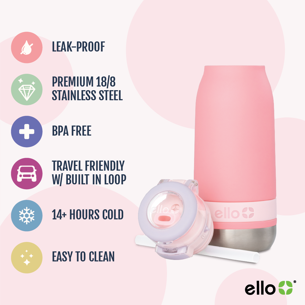 The Ello Emma 14oz vacuum insulated stainless steel kids water bottle keeps your little ones hydrated with cold-staying power. Vacuum insulated 18/8 stainless steel keeps beverages cold for 14+ hours. Emma's leak-proof locking flip lid features an XL push button for smaller hands and a fully-covered and yuck-free straw that minimizes spills. A built-in carry loop makes it super easy to stay hydrated on-the-go.
