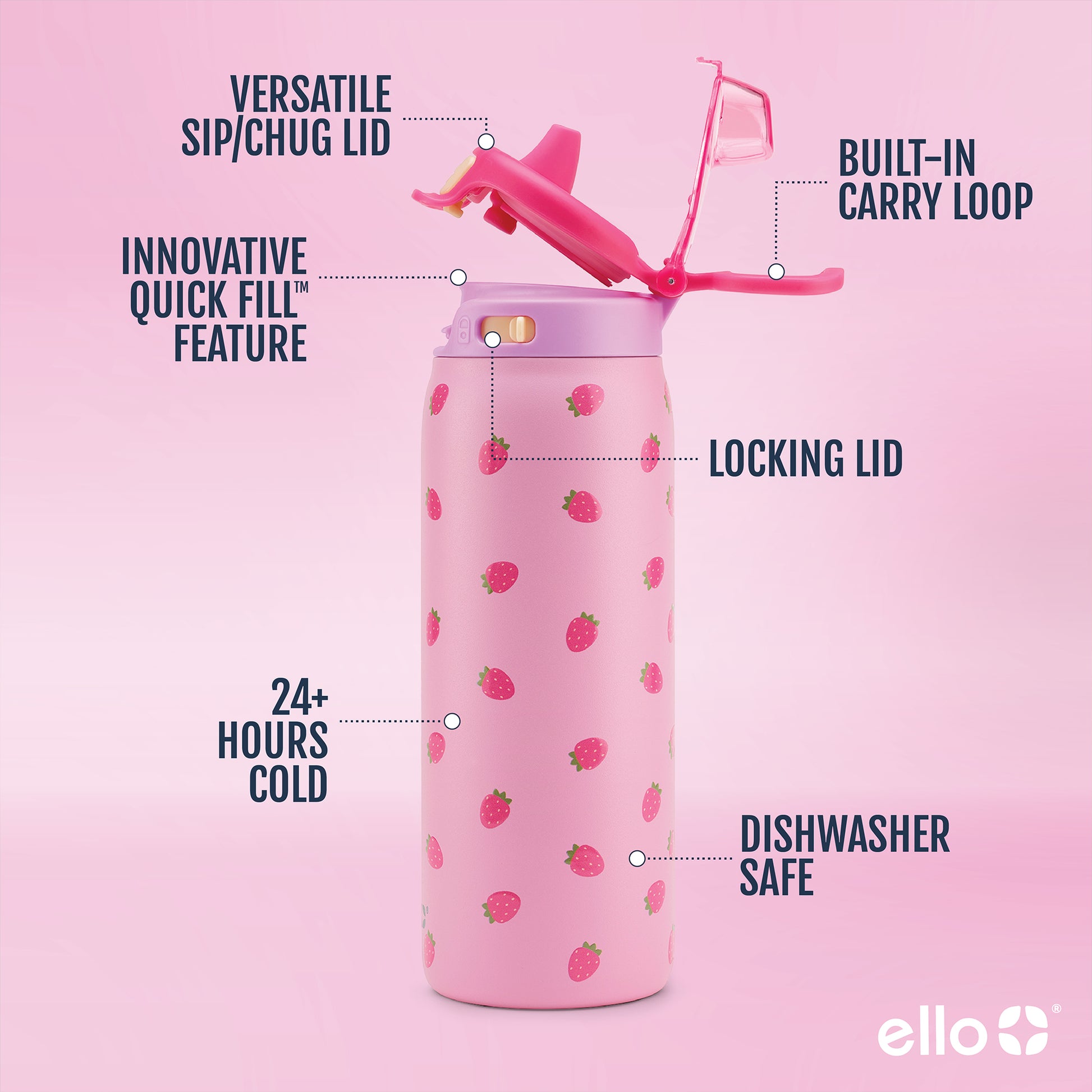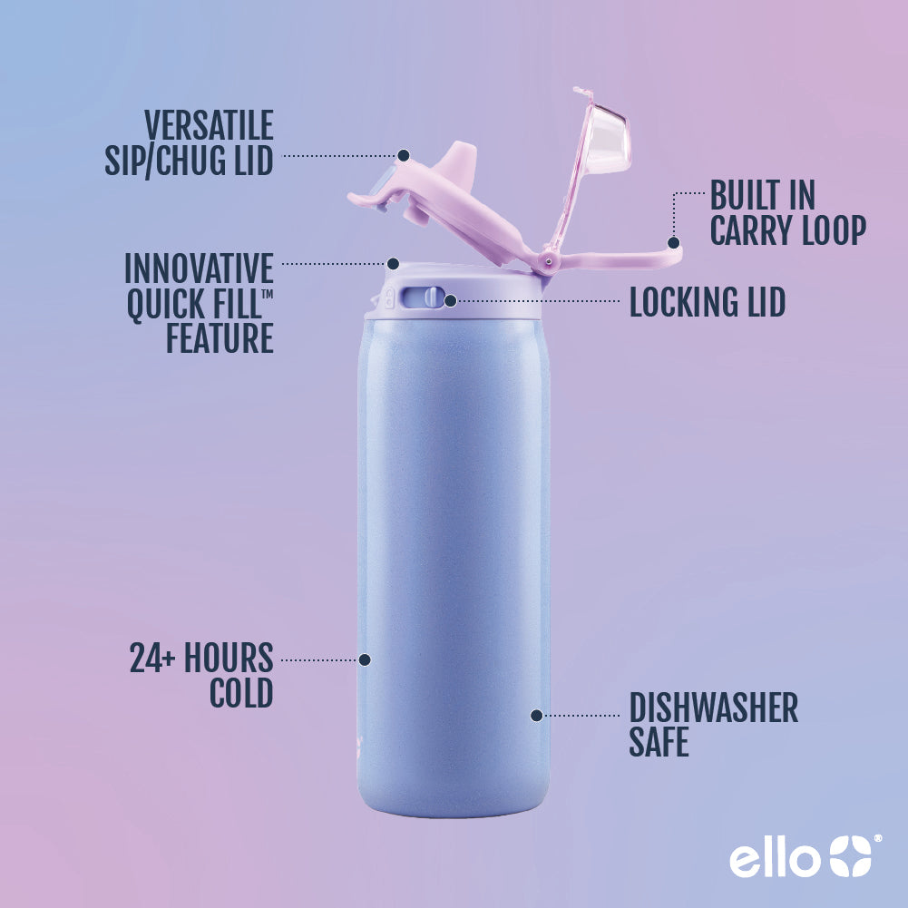 The Ello Kids 18oz Pop & Fill is the perfect sidekick for school, sports, and everything in between. The Quick Fill⢠lid flips open wide for easy refills with no twisting, no spills, and no adult help required. Kids can sip from the straw or chug from the wide mouth, and the double-wall stainless steel keeps drinks cold for up to 20 hours. With a slim, cup holderāfriendly design and a built-in carry loop, itās made to go wherever they do.
