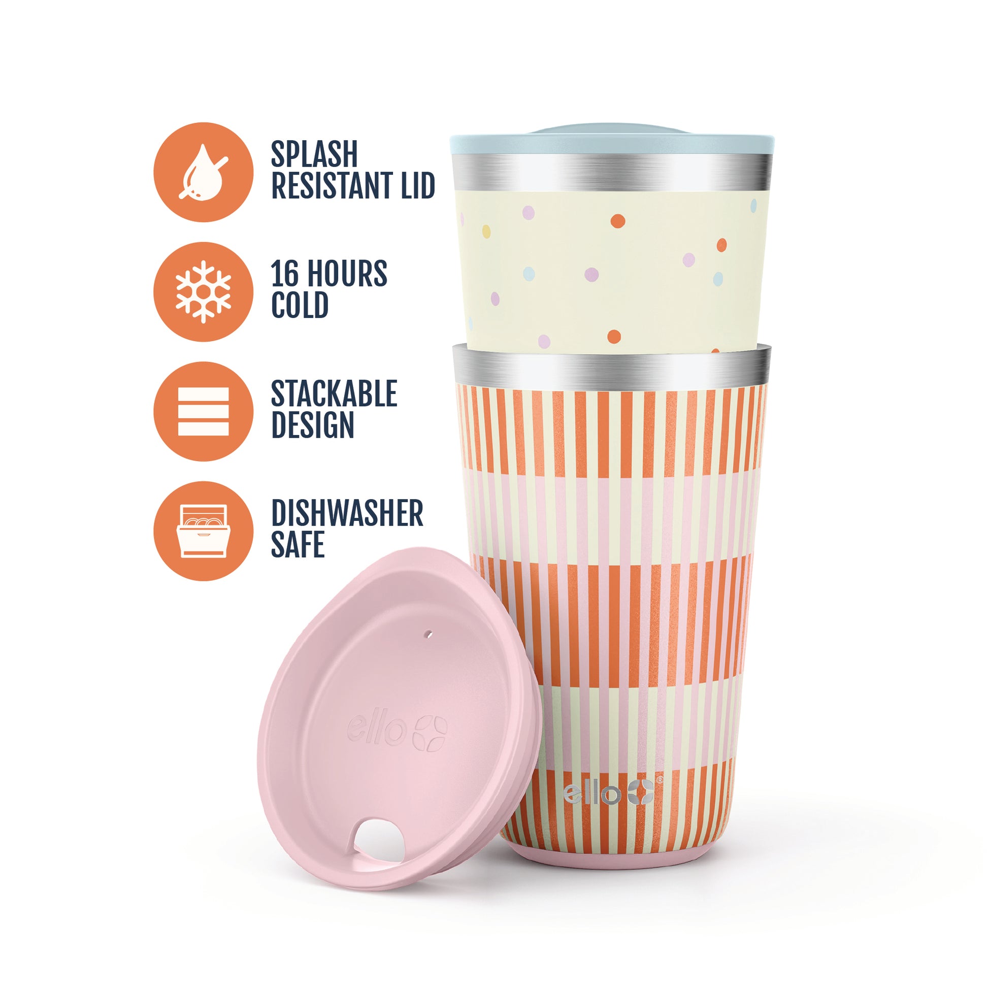 Serve up the fun with the Ello 2 Pack Stainless Steel Stacking Cups, perfect for parties, picnics, or everyday hydration. Each cup comes with an easy press lid for splash-resistant sipping, making them the perfect cups for everything from iced coffee to cold beers. Reusable and made to last, these stainless steel party cups are a sustainable alternative to disposable plastic. Durable, reusable, and always ready to chill, Ello stacking cups are made to bring a little extra joy to every sip.