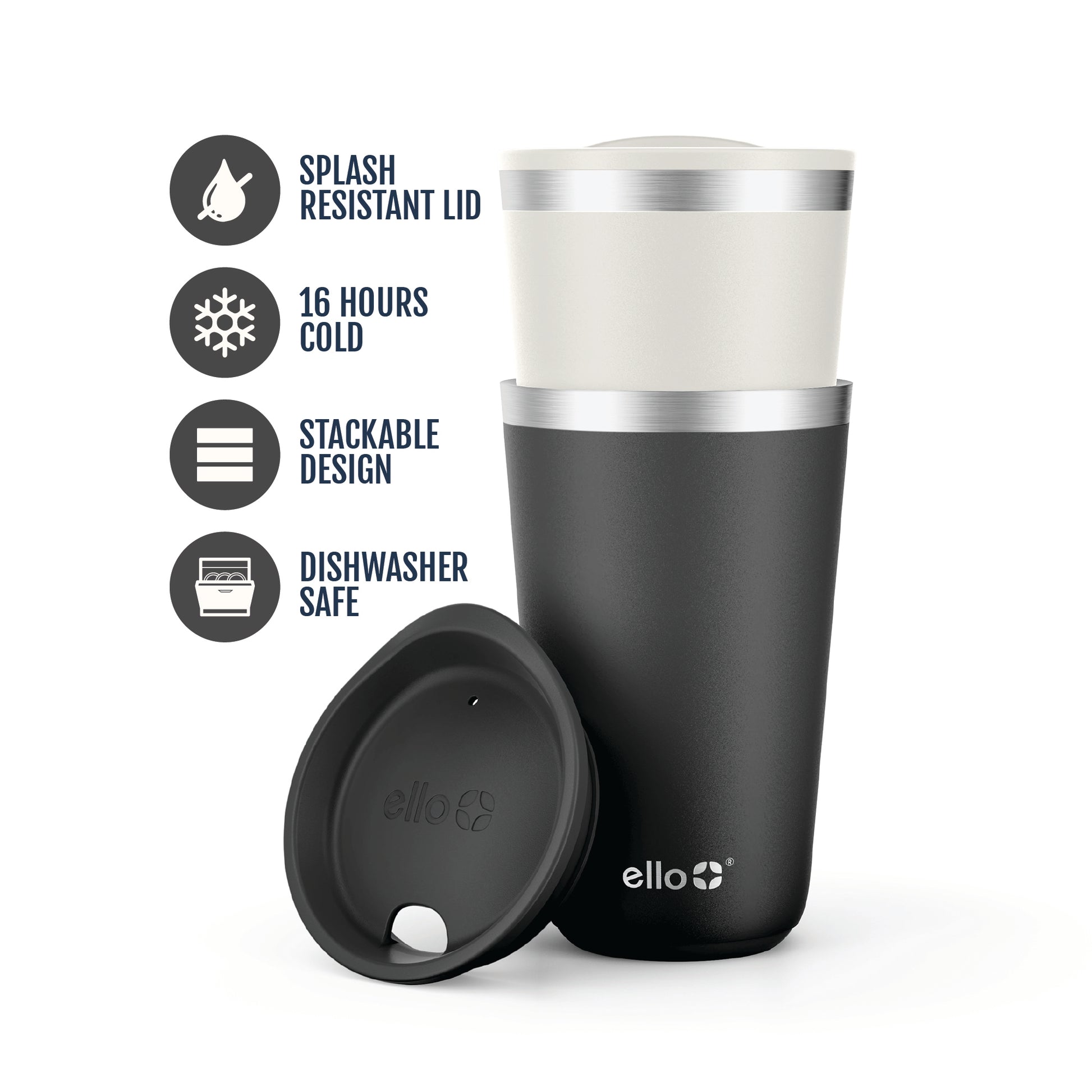 - WHAT'S INCLUDED: Comes with two 16oz stainless steel cups and two matching splash resistant easy press lids.